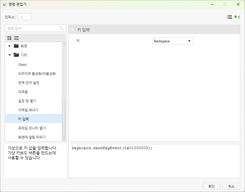 - 입력 키를 선택한 후 동작 탭으로 이동합니다. 각 입력 키에 대해 누를 때 동작을 설정합니다. 새 명령 추가 후 명령 편집기에서 동작의 명령 종류를 키 입력으로 설정합니다. 키의 파라미터는 해당하는 숫자 또는 기호로 설정합니다. 아래에 1번 키의 명령 편집기 예시가 나와 있습니다.