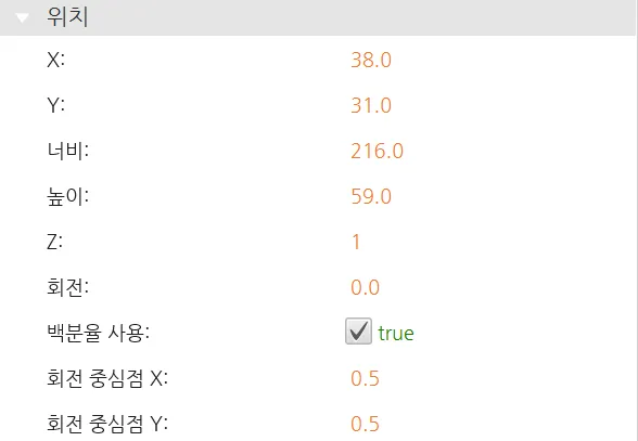 섹션 제목: “게이지 위치”위치 섹션에서는 오브젝트를 이동하거나 크기를 조정할 수 있는 속성을 제공합니다.