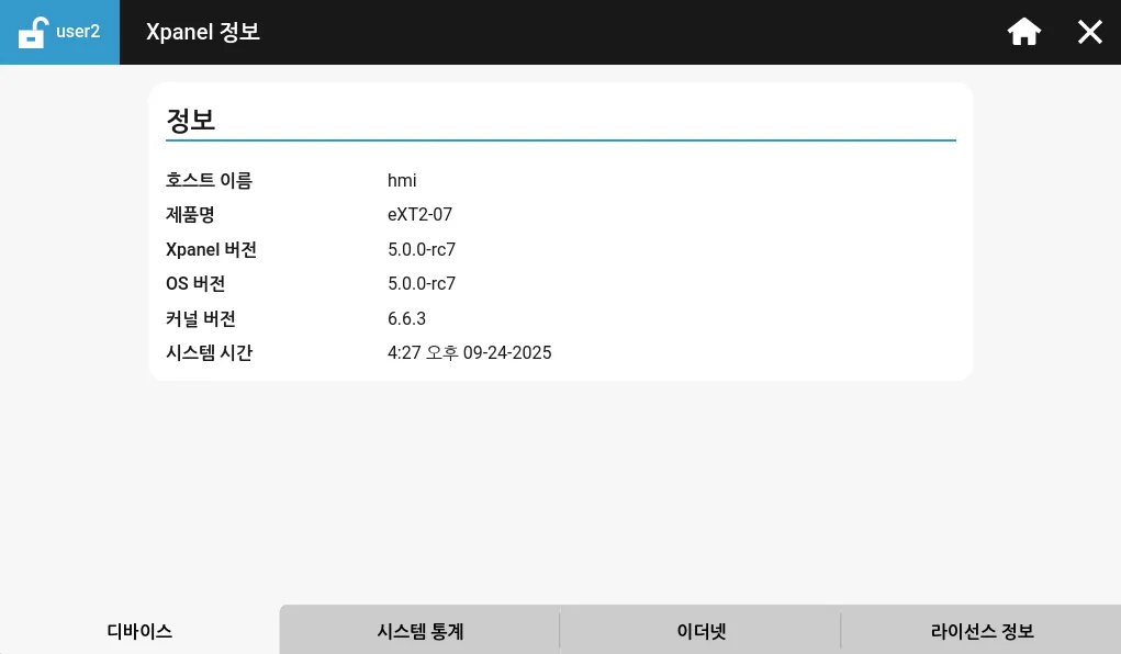 디바이스 탭은 호스트 이름, 제품명, Xpanel 버전, OS 버전, 커널 버전 및 시스템 시간을 포함한 정보를 표시합니다.