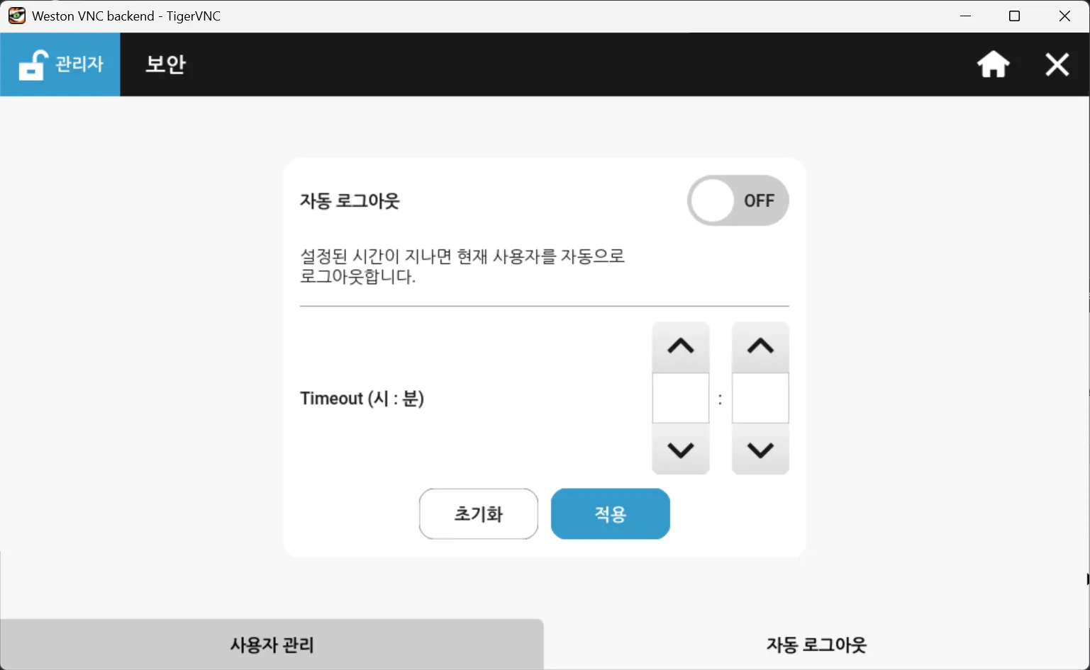 자동 로그아웃 탭은 활성화된 경우, 로그인한 사용자에 대한 자동 타임아웃을 구성합니다. 설정된 시간이 경과하면 현재 로그인한 사용자는 로그아웃됩니다.
