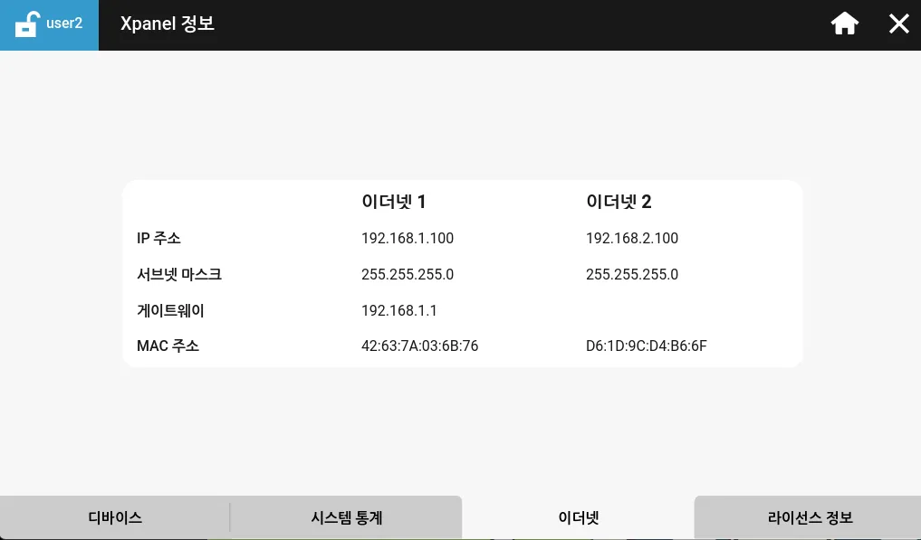 IP 구성 탭은 사용자가 Xpanel의 각 이더넷 포트에 대한 IP 주소, 서브넷 마스크, 기본 게이트웨이를 설정할 수 있도록 해줍니다. 이러한 옵션들은 어드레스 종류가 고정으로 설정된 경우에만 설정할 수 있습니다. DHCP로 설정되어 있다면 네트워크의 DHCP에 의해 IP 주소를 할당받게 됩니다.