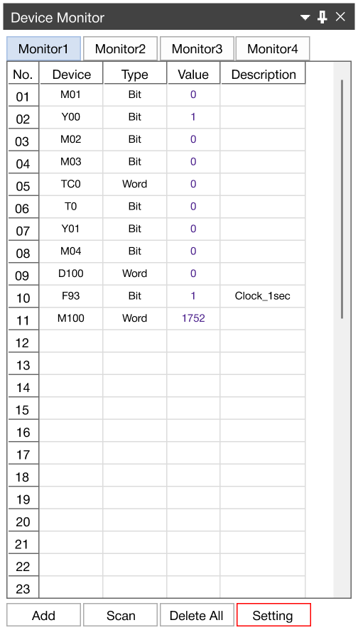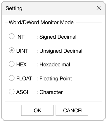 - To change the monitor value range to signed, unsigned, hexadecimal, float, or ASCII characters, left-click Setting.