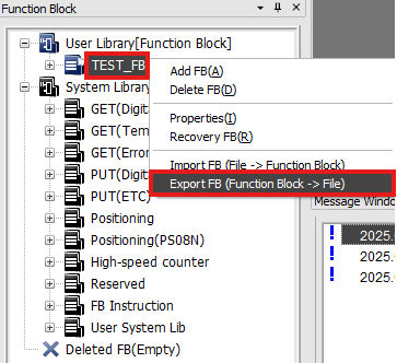 - To export a user-created Function Block, right-click on the user-created Function Block and left-click Export FB (Function Block -> File).