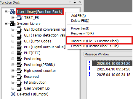 - To import a Function Block, right-click in the Function Block window and left-click Import FB (File -> Function Block).