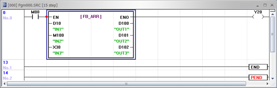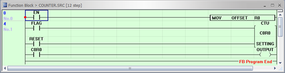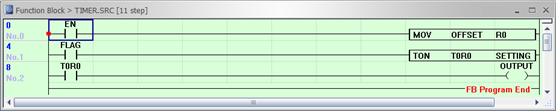To use a timer or counter in a Function Block, the index register, offset R data register, must be used. Timer and counter instructions can only use the timer and counter data registers.