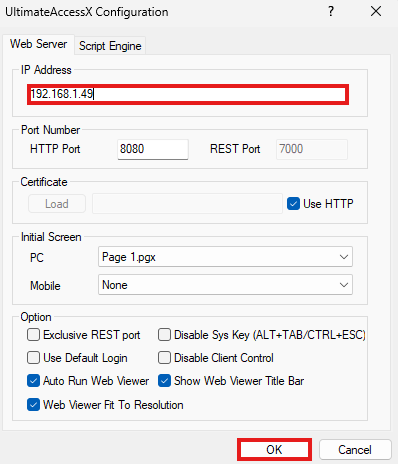 - Under IP Address, enter the IP address of the computer where UltimateAccessX will be running. Left-click OK.