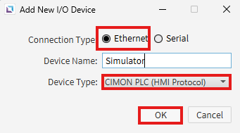 - Name the device, select CIMON-PLC Ethernet, and left-click Ok.
