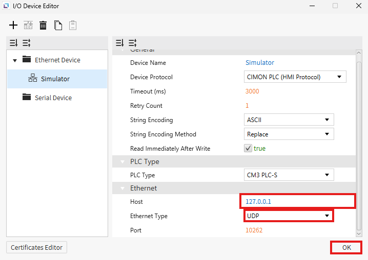 - Ensure Ethernet is selected for the Connection Type. For Device Type, use CIMON PLC (HMI Protocol).