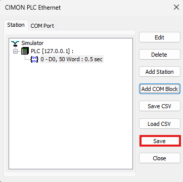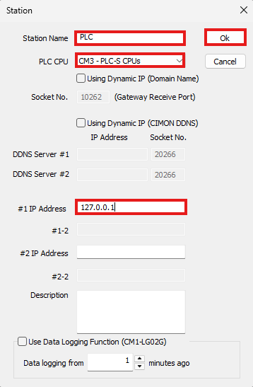 - Name the station, select the PLC CPU from the drop down, enter #1 IP Address as 127.0.0.1.