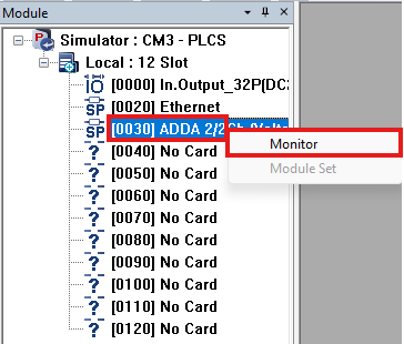 - To change the PLC input type, right-click in Module window and left-click Module Set.