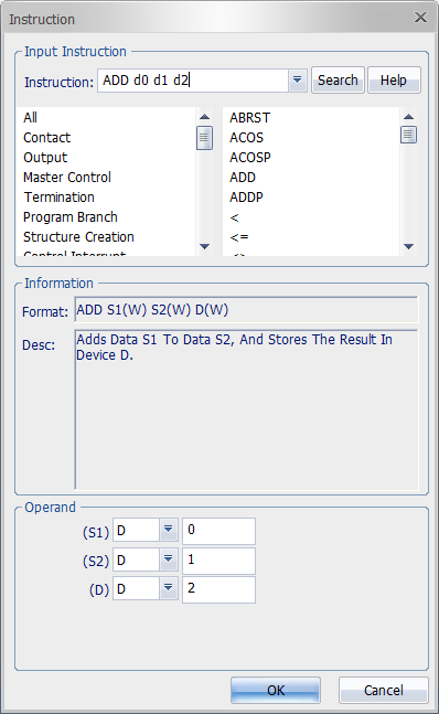Enter the instruction and operand like the Ladder Diagram program and left-click OK. The instructions will automatically be converted into Structured Text format.