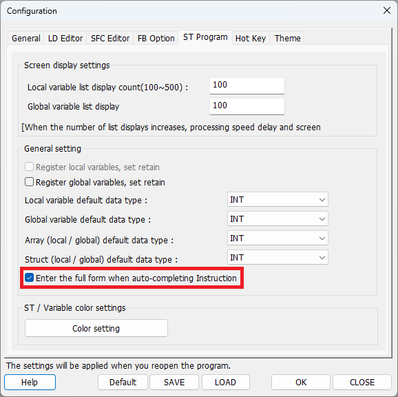 Left-click ST Program and check Enter the full form when auto-completing Instruction.