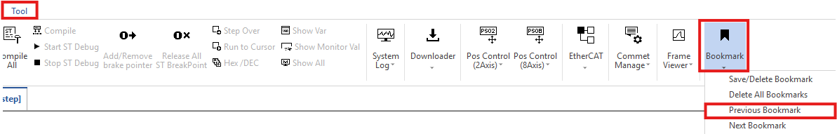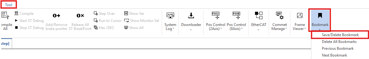 - To delete a bookmark location, select the rung to bookmark and left-click Tool, left-click Bookmark, and left-click Save/Delete Bookmark.