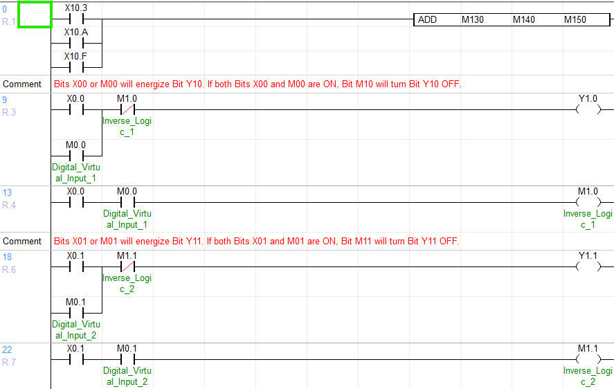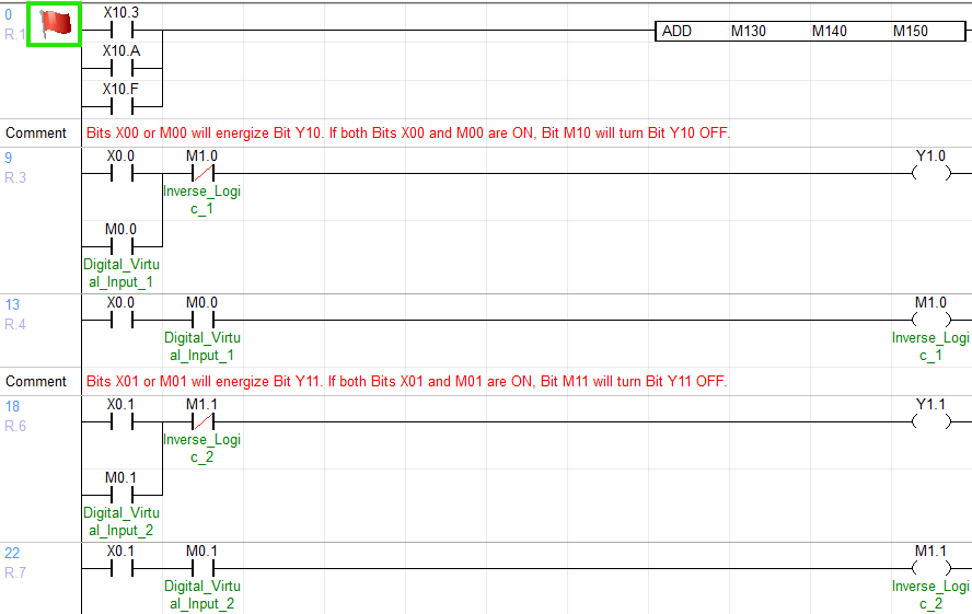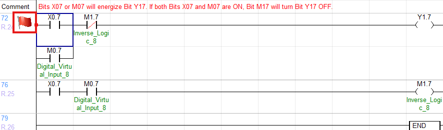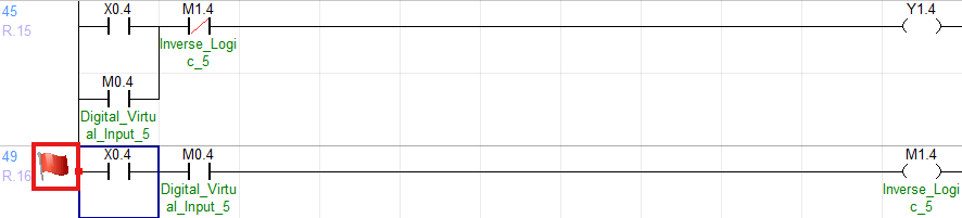 - Saved bookmarks will display a red flag at the beginning of a rung.