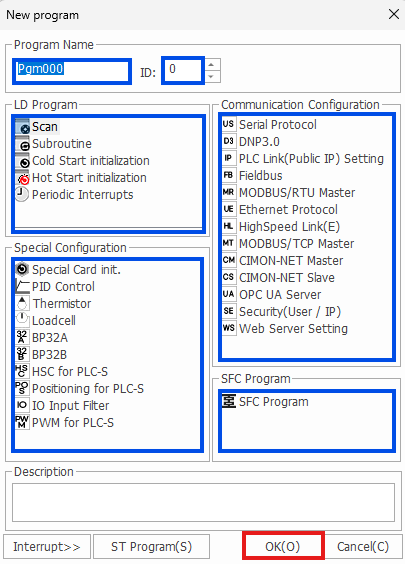 - Specify the name and ID of the program if necessary. Left-click to select the program type, and left-click OK.