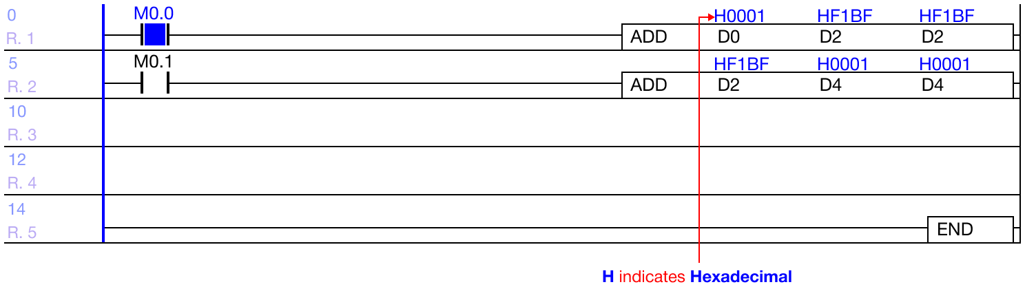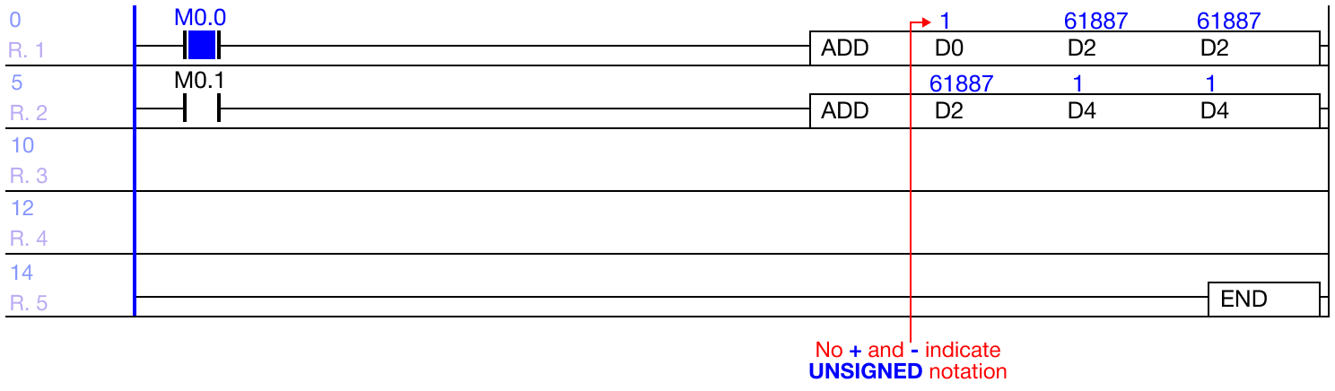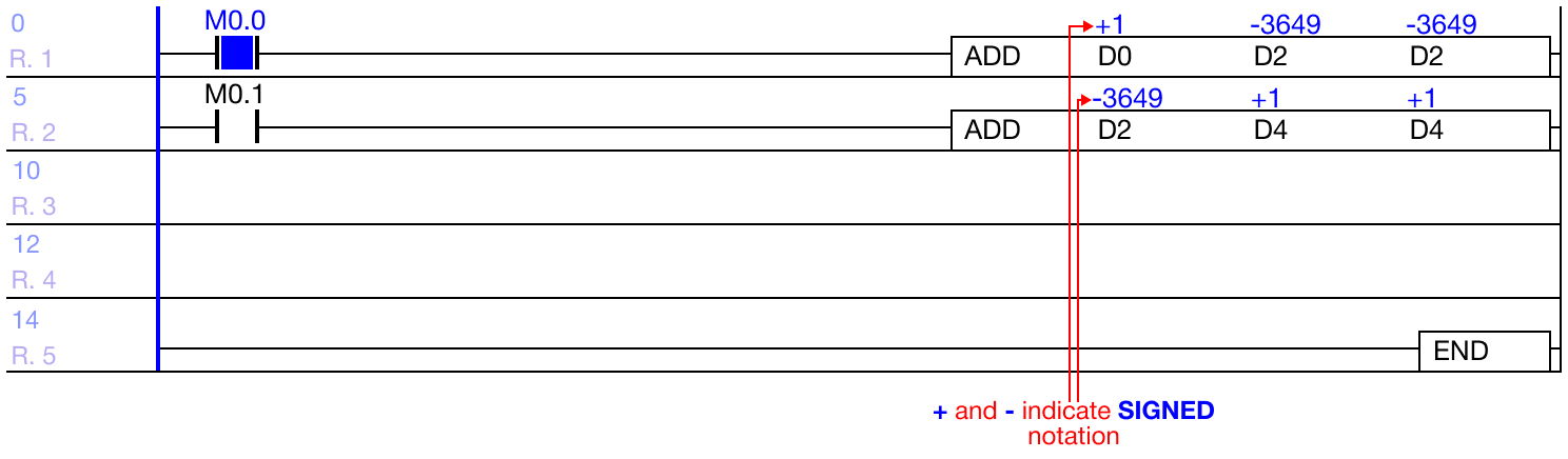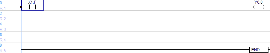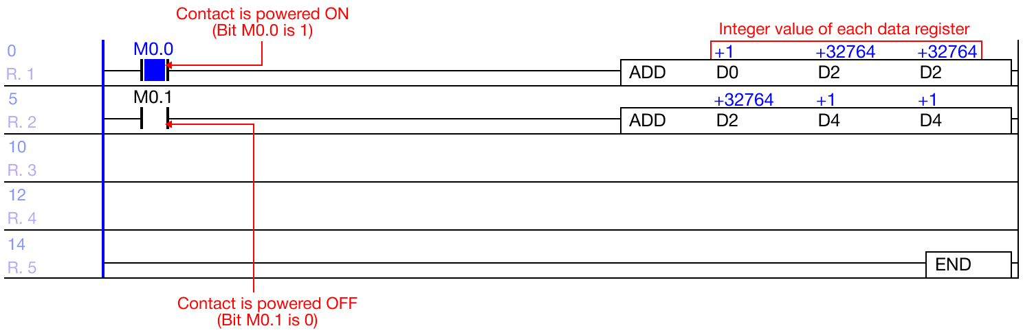 - When a contact does NOT have a blue square, the contact is not receiving power, and the contact is OFF (0).