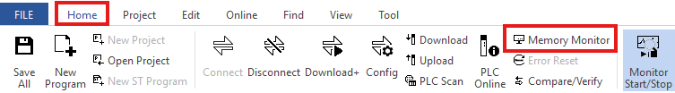 To use the memory monitor, ensure the PLC is connected and program monitoring is on.