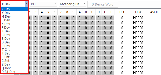 - To monitor the bit level of a data register, left-click the Device Bit button (if applicable).