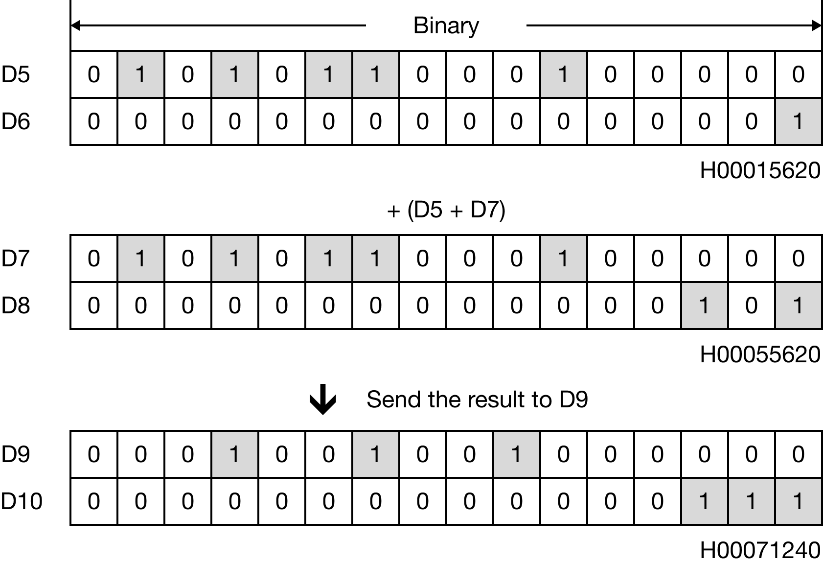 When M0.0 is powered ON, the 8-digit binary-coded decimal (BCD) data register, D5, is added to the 8-digit binary-coded decimal (BCD) data register, D7, and the sum saved in the 8-digit binary-coded decimal (BCD) data register, D9.