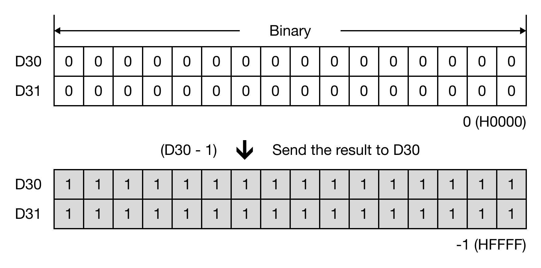 The DDEC instruction decreases the assigned DWORD data register, D, by 1 until the execution condition is OFF.