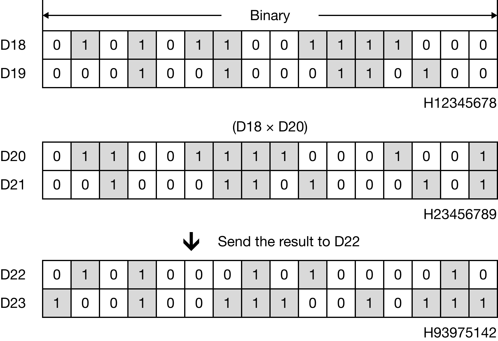 The DBMUL instruction multiplies an 8-digit binary-coded decimal (BCD) value, S1, to an 8-digit binary-coded decimal (BCD) value, S2, and saves the product in an assigned 8-digit binary-coded decimal (BCD) data register, D.