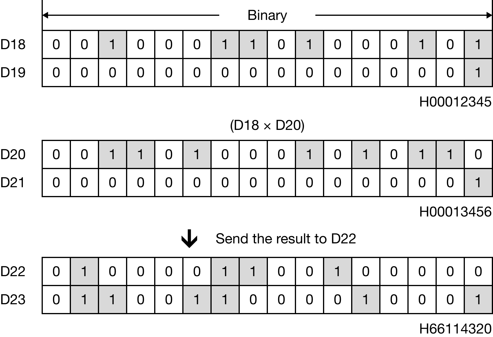 When M1.0 is powered ON, the 8-digit binary-coded decimal (BCD) data register, D18, is multiplied to the 8-digit binary-coded decimal (BCD) data register, D20, and the product is saved in the 16-digit binary-coded decimal data register, D22.