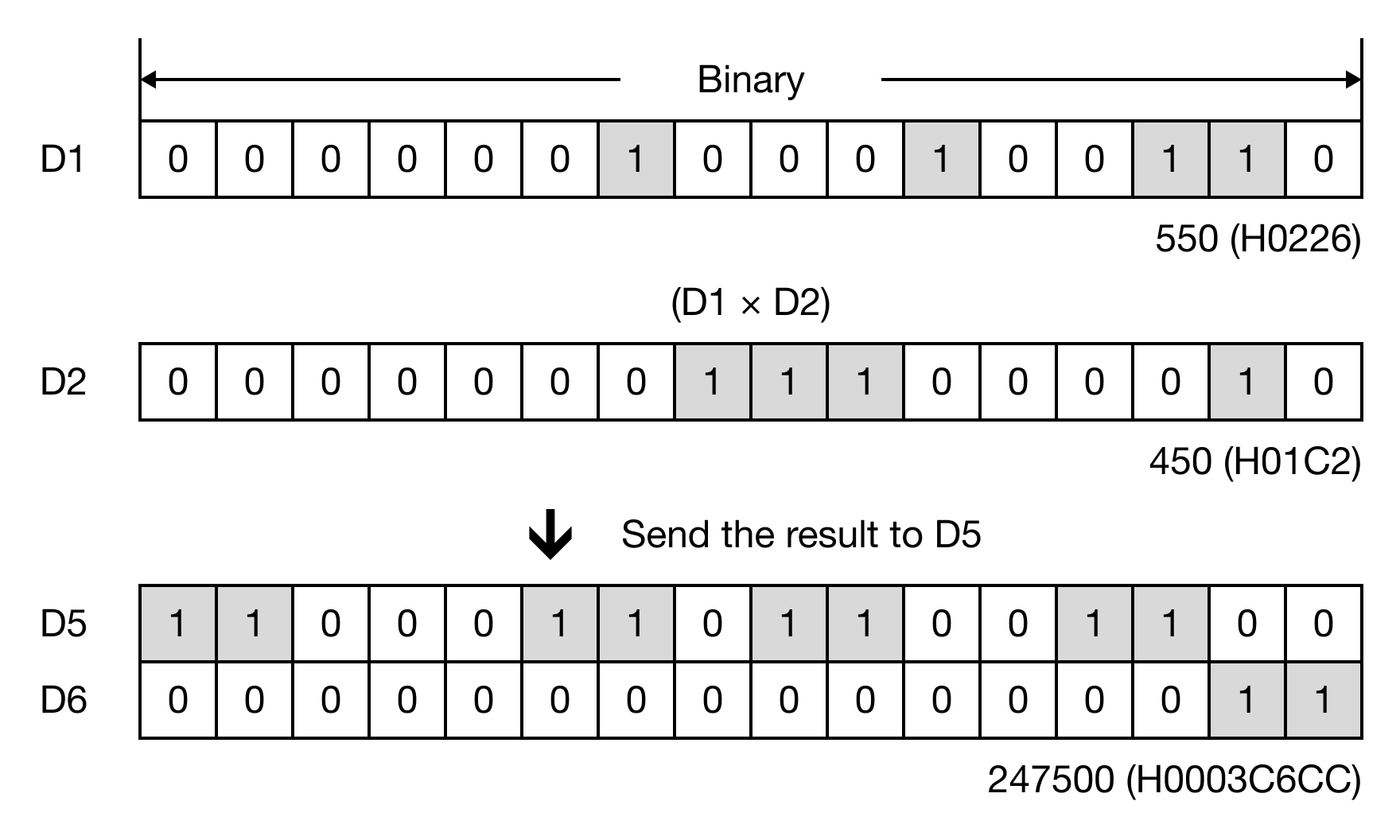 When M1.0 is powered ON, the WORD data register, D1, is multiplied by the WORD data register, D2, and the product is saved in the DWORD data register, D5.
