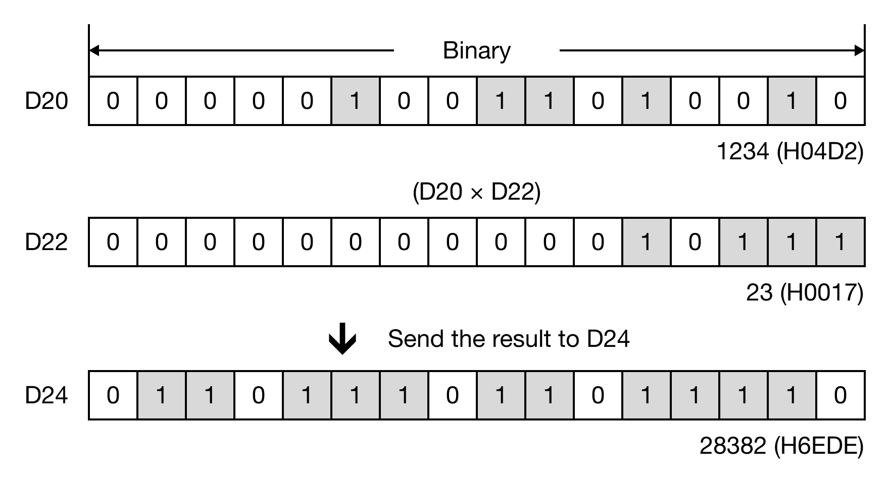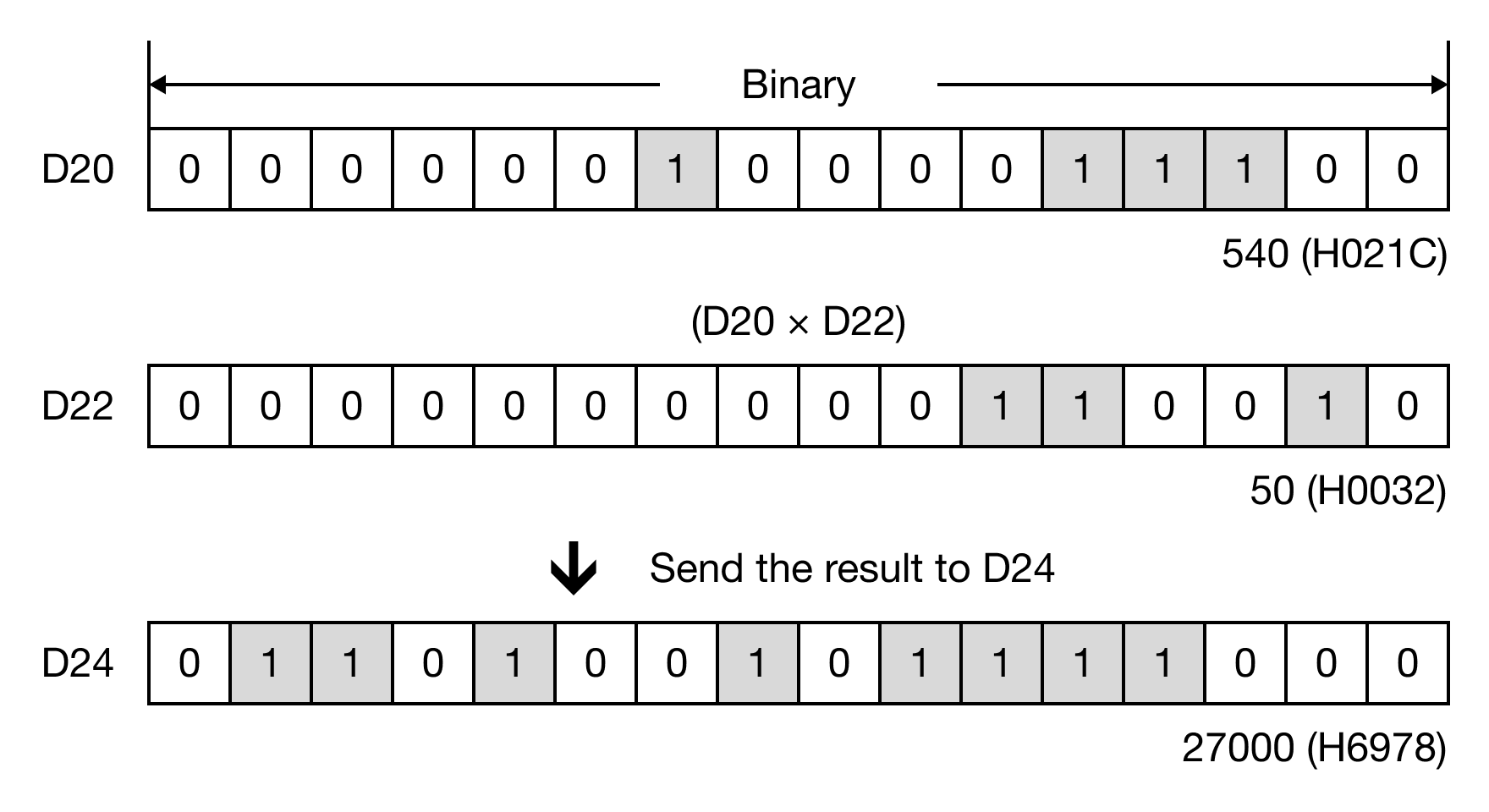 When M1.0 is powered ON, the WORD data register, D20, is multiplied to the WORD data register, D22, and the product is saved in the WORD data register, D24.