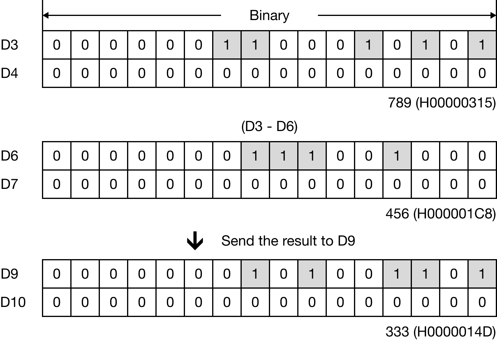 When M0.1 is powered ON, the DWORD data register, D6, is subtracted from the DWORD data register, D3, and the difference is saved in the DWORD data register, D9.
