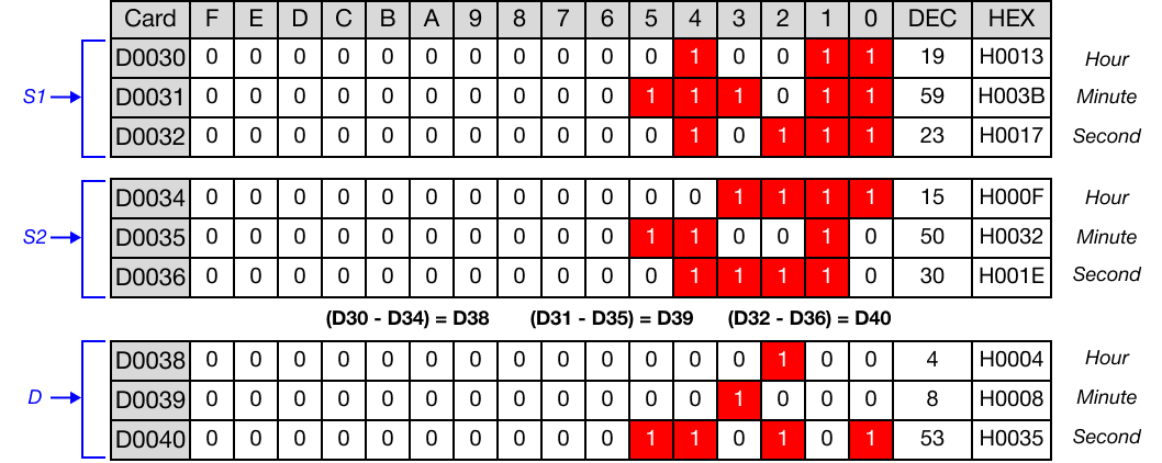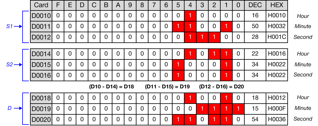 The differences are saved in the WORD date value data registers, D18, D19, and D20.