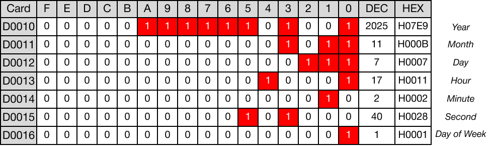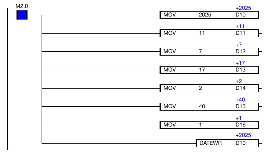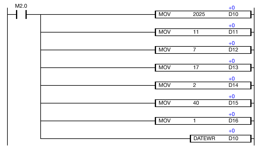 When the contact, M2.0, is powered ON (1), the instruction writes the block of time data, starting at the data register, D10, to the real time clock (RTC) device.