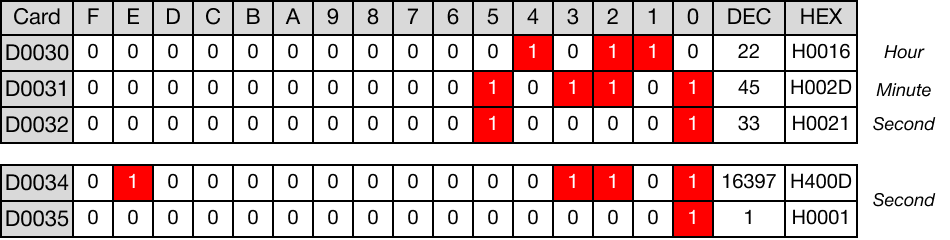 When the contact, M3.0, is powered ON (1), the time data data registers, D30, D31, and D32, are converted into DWORD second format.