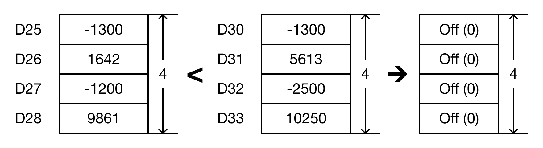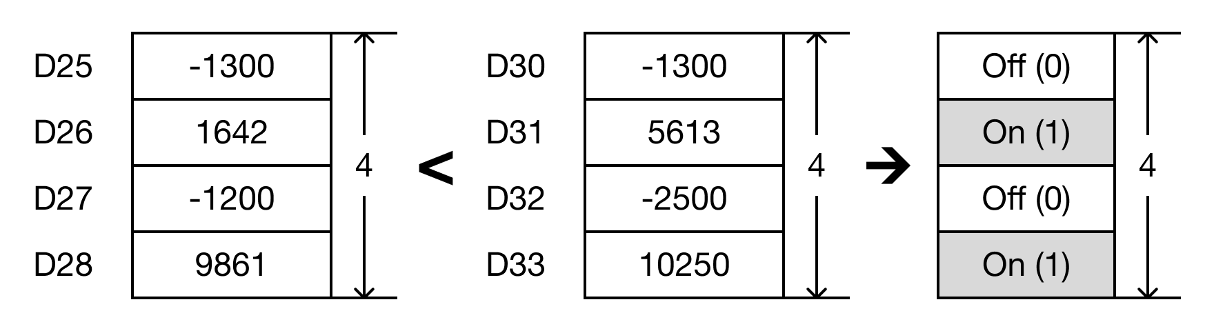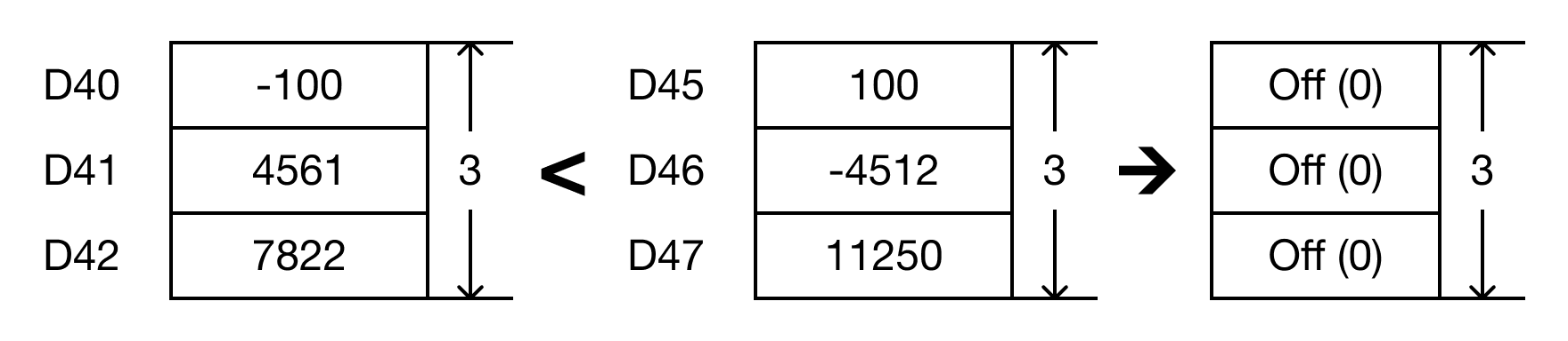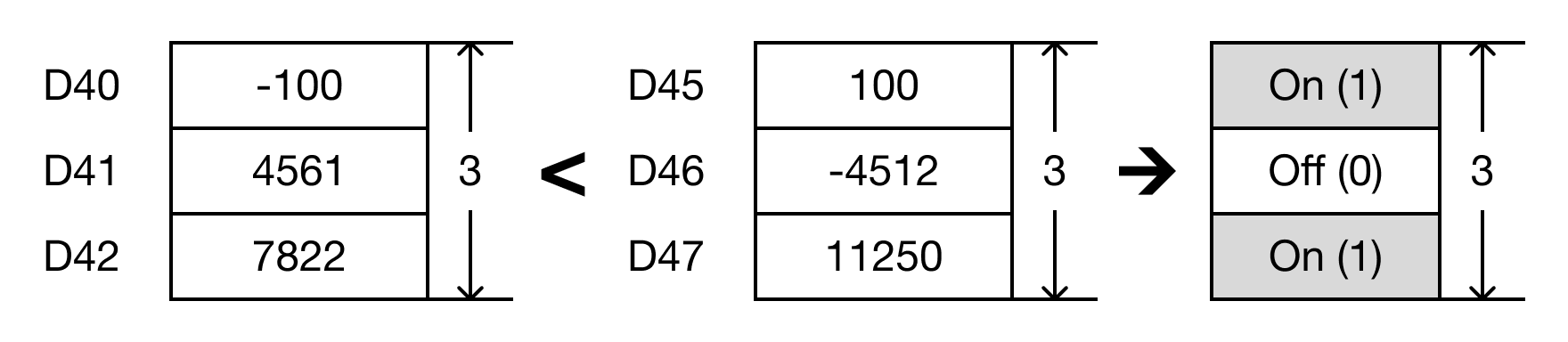For each data register in the range S1 ~ Sn that is less than each data register in the range S2 ~ Sn, the corresponding bit in the data register D, starting at bit number B, will turn ON (1).