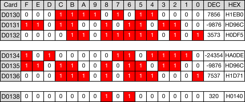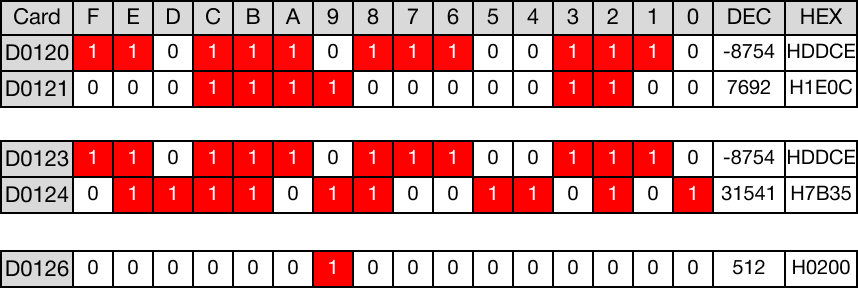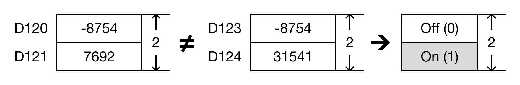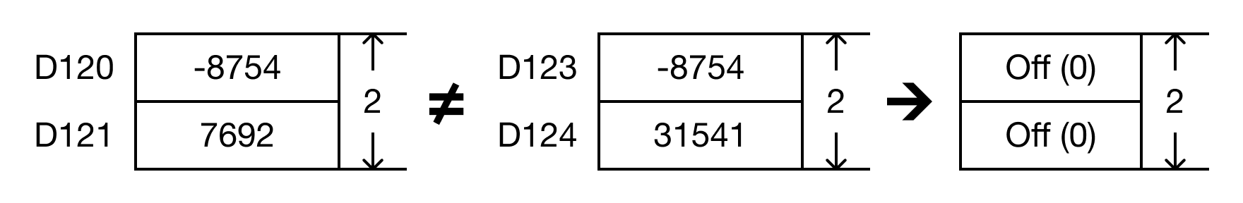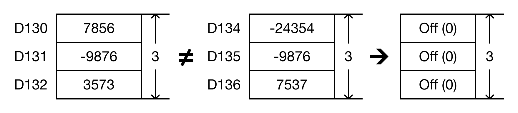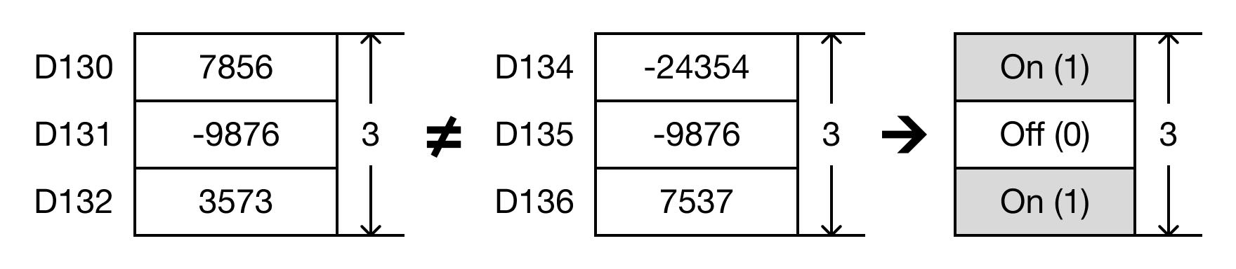 For each data register in the range S1 ~ Sn that is not equal to each data register in the range S2 ~ Sn, the corresponding bit in the data register D, starting at bit number B, will turn ON (1).