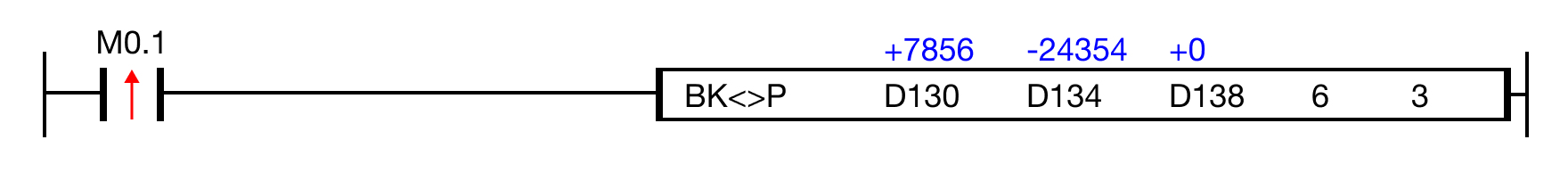 The BK<>P instruction compares n number of WORD data registers starting at S1 to n number of WORD data registers starting at S2.