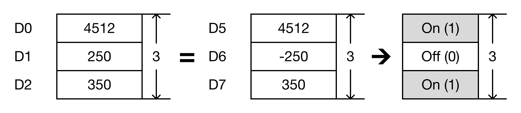 - When the open contact, M0.2, is powered ON (1), the values of the data registers are compared.
