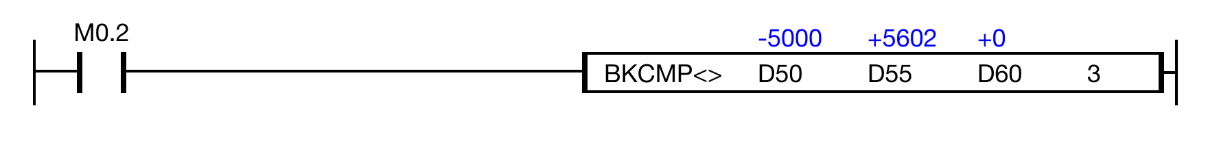 - When the open contact, M0.2, is powered ON (1), the values of the data registers are compared.