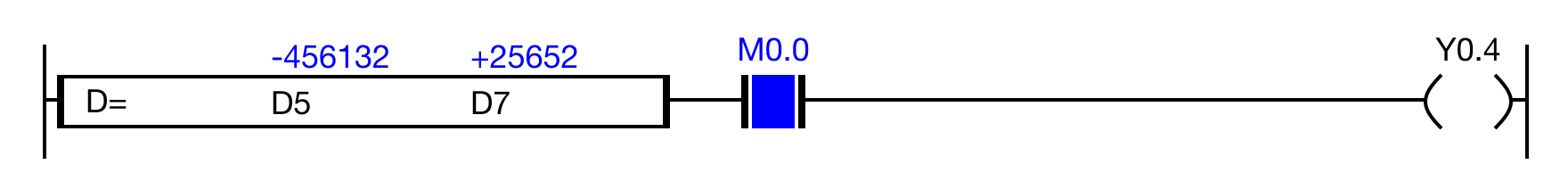 When the result of the instruction execution of the expression D5 = D7 (-456,132 = 25,652) is FALSE, and the contact, M0.0 is ON (1), the coil, Y0.4, is deenergized.