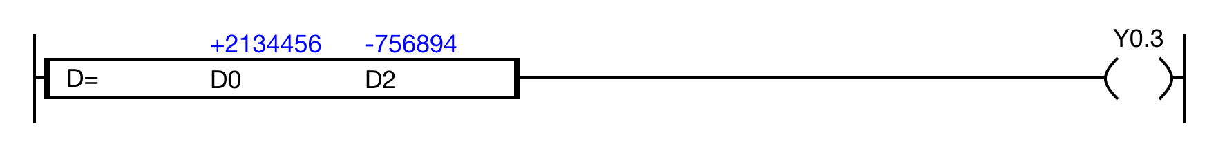 When the result of the instruction execution of the expression D0 = D2 (-756,894 = -756,894) is TRUE, the coil, Y0.3, is energized.