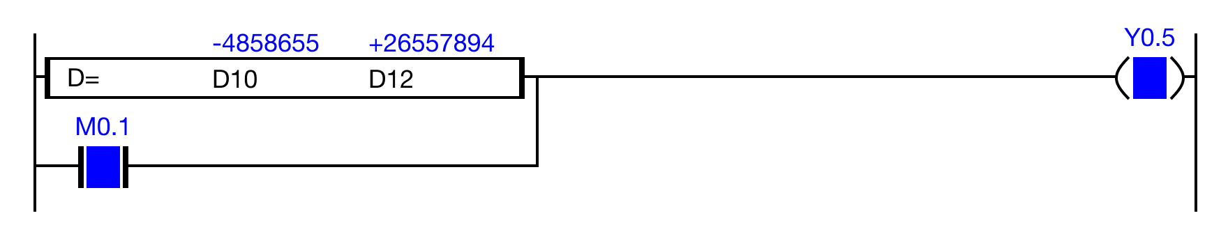 When the result of the instruction execution of the expression D10 = D12 (-26,557,894 = -26,557,894) is TRUE, and the contact, M0.1 is OFF (0), the coil, Y0.5, is energized.