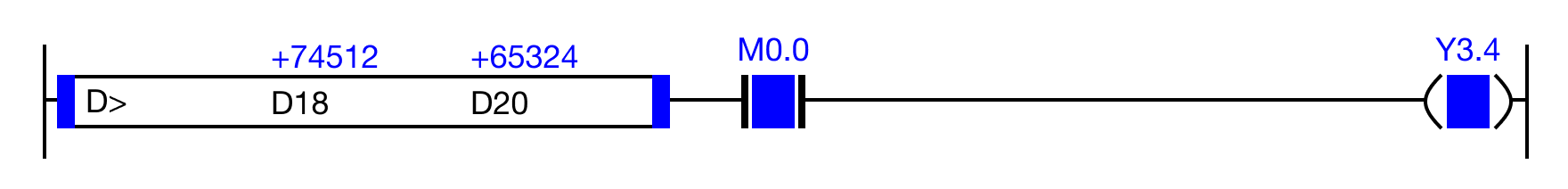 When the result of the instruction execution of the expression D18 > D20 (74,512 > 65,324) is TRUE, and the contact, M0.0 is ON (1), the coil, Y3.4, is energized.