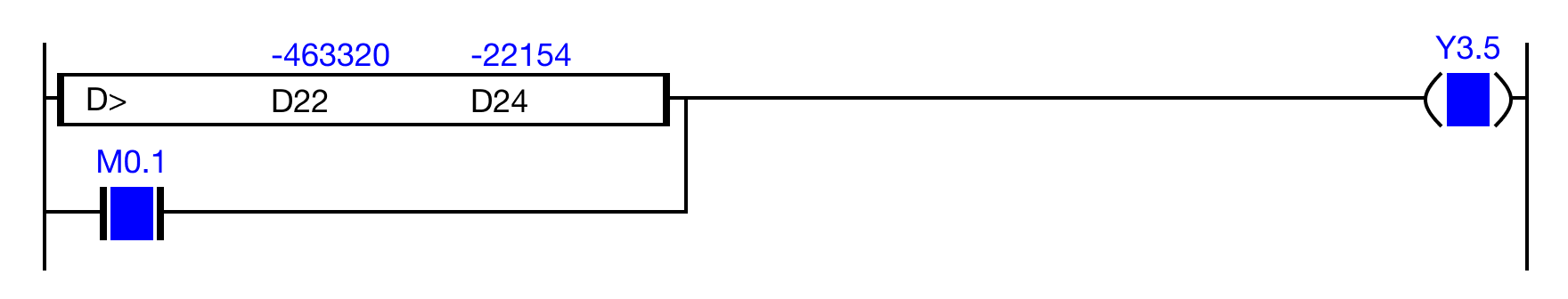When the result of the instruction execution of the expression D10 > D12 (-463,320 > -22,154) is FALSE, or the contact, M0.1 is ON (1), the coil, Y3.5, is energized.