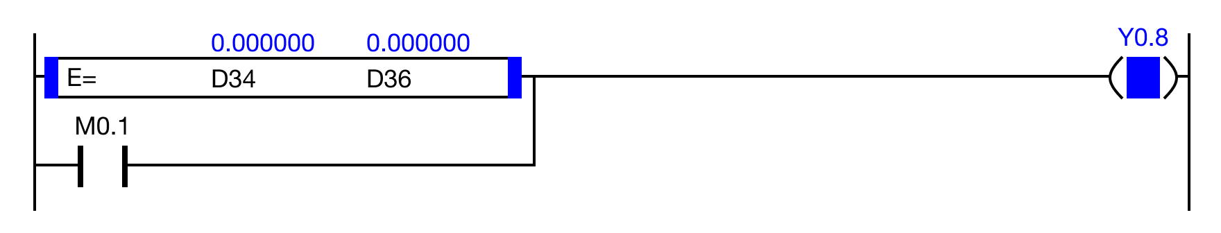 When the result of the instruction execution of the expression D34 = D36 (0.000000 = 0.000000) is TRUE, and the contact, M0.1 is OFF (0), the coil, Y0.8, is energized.