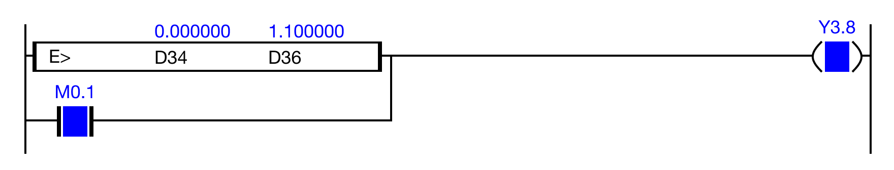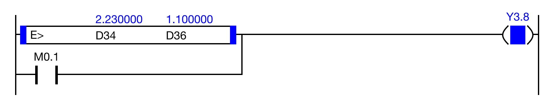 When the result of the instruction execution of the expression D34 > D36 (2.230000 > 1.100000) is TRUE, and the contact, M0.1 is OFF (0), the coil, Y3.8, is energized.