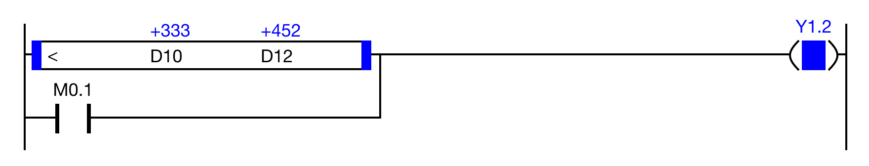 When the result of the instruction execution of the expression D10 < D12 (333 < 452) is TRUE, and the contact, M0.1 is OFF (0), the coil, Y1.2, is energized.