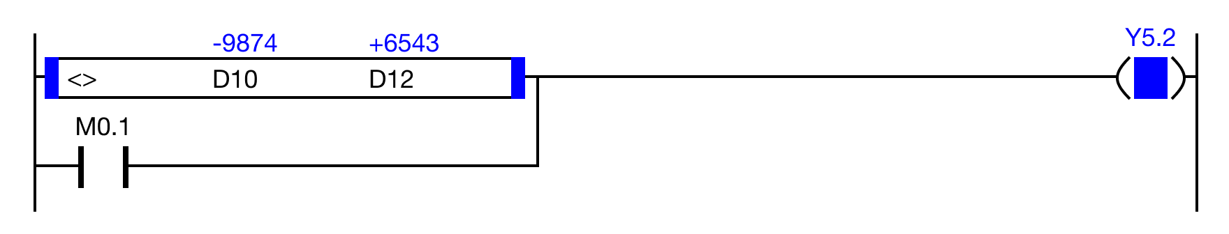 When the result of the instruction execution of the expression D10 ≠ D12 (-9,874 ≠ 6,543) is TRUE, and the contact, M0.1 is OFF (0), the coil, Y5.2, is energized.