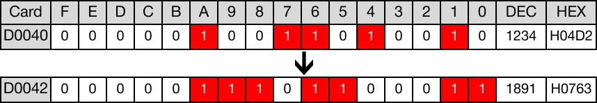 When the contact, M1.8, is powered ON (1), the value of the gray code WORD data register, D40, 1,234, is converted into binary notation.