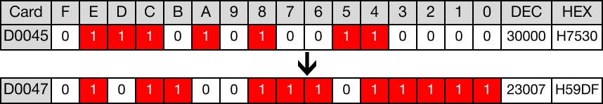 When the contact, M1.6, is powered ON (1), the value of the gray code WORD data register, D45, 30,000, is converted into binary notation.