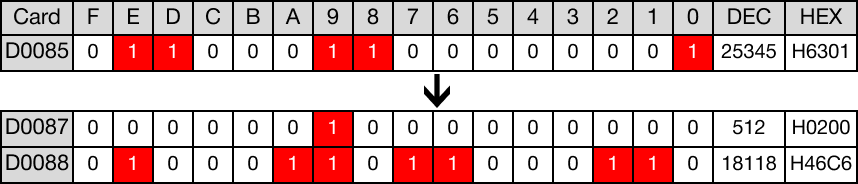 When the contact, M3.5, is powered ON (1), the value of the WORD data register, D80, -12,345, is converted into float notation.