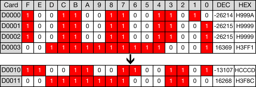 When the contact, M5.1, is powered ON (1), the value of the LREAL data register, D20, 99.900000, is converted into 32-bit float notation.